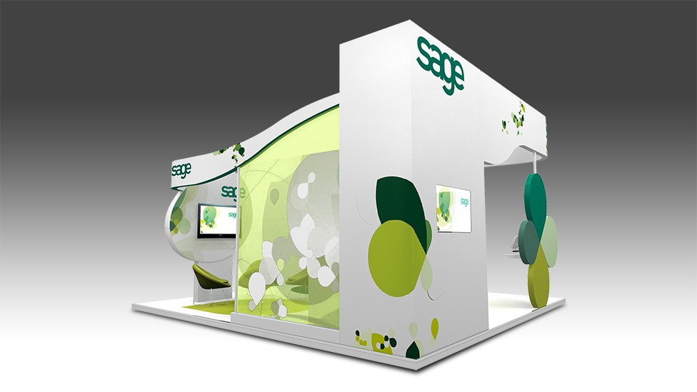 For the structure of the stand we wanted to create a dynamic, flowing feel with the highly distinctive Sage branding. Using the full height allowance of 4 metres, we designed a sturdy and eye-catching framework full of soft edges and flowing curves.